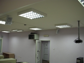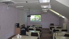 U sali za studente montirano je i instalirano platno i projektor. Prostorija je pokrivena sa nadgradnim 100V JEL zvučnicima.
