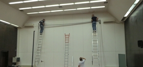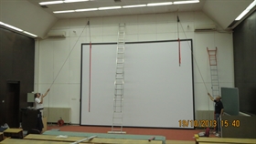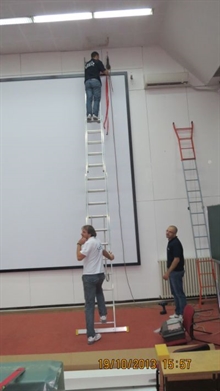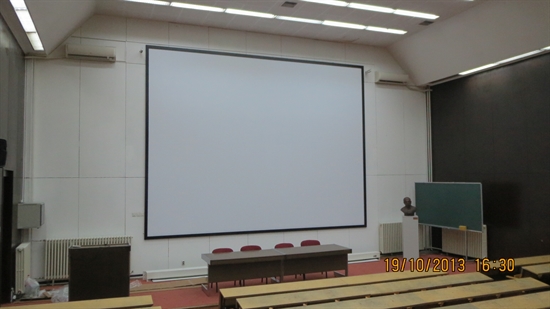 Na zahtev klijenta u amfitetru fakulteta je uz mnogo napora demontirana velika šina sa plafona i instalirano moderno motorizovano projekciono platno veličine 6x4m i postavljen projektor.